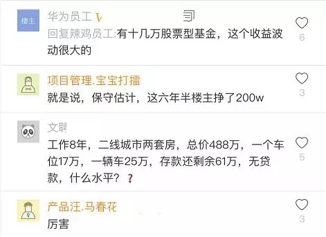 华为员工实力炫富,工作六年一套房一辆豪车,存款六十万 ![]() 近日,一名标签为华为的网友在职场匿名社区晒出了自己的存款图,从图中看,其存款在六十万左右。 ![]() 根据描述,该程序员在二线城市买了一套房,首付七十万,还买了一辆豪车。晒出来的存款收入引来了不少网友的热议: ![]() 有网友评论:也就是说保守估计,这六年楼主挣了200W。 ![]() 而且,该程序员表示买房买车这些钱都是自己出的,父母都是农民,每年还会给爸妈三四万。你们的目标月薪是多少呢? 看到这些,小编感觉整个周末都过不好了。你们呢?快留言炫富吧。 |