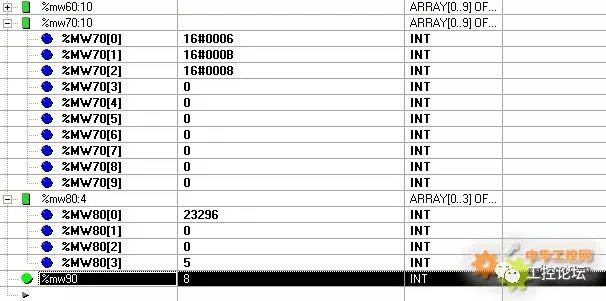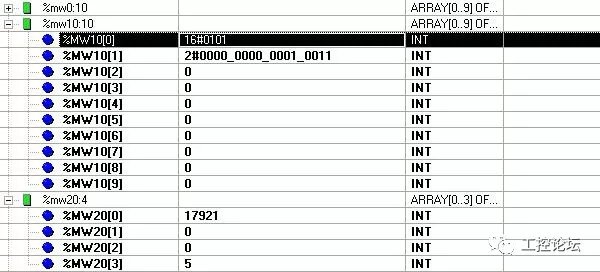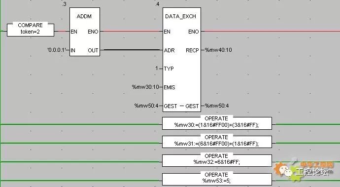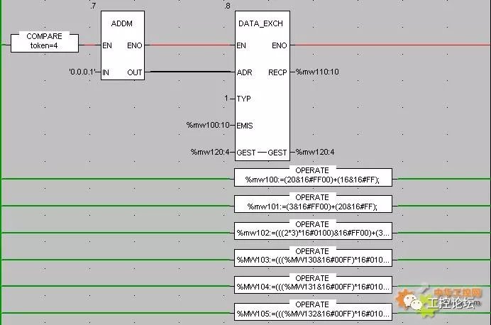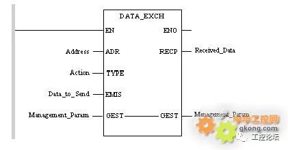Modbus通讯编程实例(一) 最近单独在写Modbus和现场总线的介绍,都是一些思路性质的介绍,不涉及具体的实例,可能很多童鞋还是觉得不够具体,因为我现在不做具体的编程调试了,所以直接些实例很费劲。参考了一些网上的和施耐德电气内部的资料,写成以下的案例,用了一些其他人的劳动成果,如果原作者在意版权问题,请联系我,我尊重您的所有权。 我的帖子里提过Modbus的功能码,常用的没几个,这里列出更多的(也不是全部): 功能码(十进制)十六进制说明 0101读线圈 0202读离散量输入 0303读保持寄存器 0404读输入寄存器 0505写单个线圈 0606写单个寄存器 0707读异常状态 0808诊断 110B获得事件计数器 120C获得事件记录 150F写多个线圈 1610写多个寄存器 1711报告从站ID 2216屏蔽写寄存器 2317读/写多个寄存器 2418读FIFO队列 DATA_EXCH功能块是用于Premium和M340传输数据到另外一台设备,这个功能块支持Modbus所有的功能码。 DATA_EXCH用梯形图表示: ![]() 各个引脚定义: ADR为地址引脚,对于PREMIUM系列需要使用ADDR功能块连接。 对于M340系列需要使用ADDM功能块连接。 TYPE为类型引脚,1为接受/发送,2为只接受,3为只发送。 EMIS为要发送表 RECP为接受表 GEST为交换管理表 实例一:读取N位(功能码01) ![]() 其中在EMIS数组中第一个字,低字节为功能码01,高字节为读取位的起始位1 第二个字,低字节为读取位的起始位1,高字节为读取位的长度5 第三个字,低字节为读取位的长度5 最后要在交换管理表的第四个字中定义这个报文字节的长度,为1个字节的功能码,2个字节的数据起始地址,2个字节的读取位的长度,所以长度为1+2+2=5 在TWIDO中赋值如下: ![]() 在RECP中第一个字为返回码 第二个字为读取的数据 ![]() Modbus通讯编程实例(二) 实例二:读取N字(功能码03) ![]() 其中在EMIS数组中第一个字,低字节为功能码03,高字节为读取字的起始地址1 第二个字,低字节为读取字的起始地址1,高字节为读取字的长度6 第三个字,低字节为读取字的长度6 最后要在交换管理表的第四个字中定义这个报文字节的长度,为1个字节的功能码,2个字节的数据起始地址,2个字节的读取字的长度,所以长度为1+2+2=5 在TWIDO中赋值如下 ![]() 在RECP中第一个字为返回码 第二个字开始为读取的数据 ![]() Modbus通讯编程实例(三) 实例三:写单字(功能码06) ![]() 其中在EMIS数组中第一个字,低字节为功能码06,高字节为从站要写入字的地址11 第二个字,低字节为从站要写入字的地址11,高字节为主站写出字的地址90 第三个字,低字节为主站写出字的地址90 最后要在交换管理表的第四个字中定义这个报文字节的长度,为1个字节的功能码,2个字节的从站写入字地址,2个字节的主站写出字地址,所以长度为1+2+2=5 在主站赋值如下 ![]() 在TWIDO中显示如下: ![]() Modbus通讯编程实例(四) 实例四:写N字(功能码16) ![]() 其中在EMIS数组中第一个字,低字节为功能码16,高字节为从站要写入字的起始地址20 第二个字,低字节为从站要写入字的起始地址20,高字节为要写入字的长度3 第三个字,低字节为要写入字的长度3,高字节为2倍的要写入字的长度 第四个字~第六个字为主站写出字,高低字节顺序要相互转换 最后要在交换管理表的第四个字中定义这个报文字节的长度,为1个字节的功能码,2个字节的从站写入字地址,2个字节的写入字的长度,1个2倍的要写入字的长度,6个字节的主站写出字,所以长度为1+2+2+1+6=12 在主站赋值如下 ![]() 在TWIDO中显示如下 ![]() 另外注意刷新数据时,必须要把EN引脚断开一下才可以重新读取或写入。通过实验,把交换管理表的完成位(即GEST第一个字的最低位)放在EN引脚前不太好使,所以最好编个令牌循环指令。把令牌放在EN引脚前,当取得令牌时再读取或者写入。 ![]() 功能码05: ![]() |