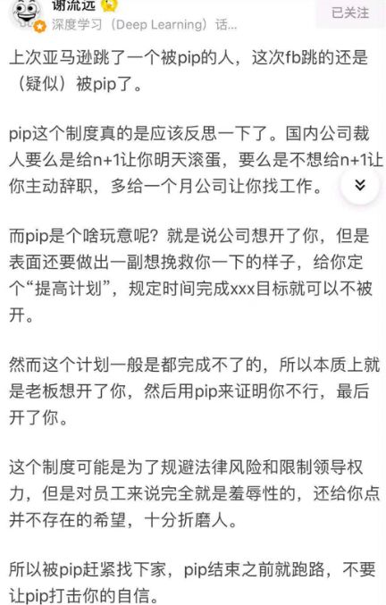 PSC:绩效考核,全称是什么,我也不知道 PIP:全称performance improvement plan 这PIP是个啥玩意儿,请看下图。 阿里的3.25,华为的C,每次考核10%的指标,没有晋升、没有年终奖,不能转团队,连续两次强行劝退,一次考核背锅只要老板愿意,留下来还是有翻身可能的。 据网友反映,亚马逊每年15%,Facebook每年10%的员工被PIP,几乎没有留下的可能。 当事人进入这么一个坑逼组也很好理解,人员流动大,乱的一比,公司内部人不难了解到,没有谁会想不通转到这里来。 只能从外面社招不明真相的冤大头,业内人士稍加打听也能知道情况,不会轻易来这里,而对于当事人,37岁还在外包公司,急需上岸,哪怕了解情况,这里做广告产品,无论是镀金还是报酬,都比外包火坑公司强太多,于是就上船了。 然而迎接自己的是PIP,再次失业…… 总结一下: 1、当事人在30岁那年,花费一笔大钱去美国读硕士。 费用可以参考知乎上一位ID叫做「小毒物」的用户,她本硕分别就读于北京师范大学和约翰·霍普金斯大学,两所中美知名高校,本硕都是计算机专业,可谓又红又专。 她在本相关问题的回答中介绍了自己: