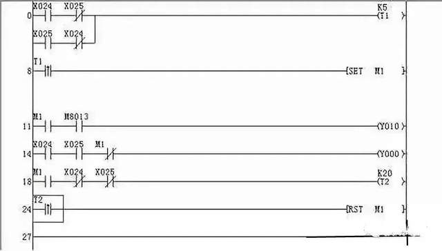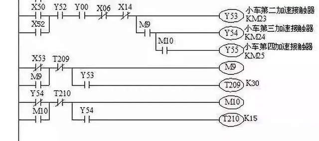 01 (1)PLC控制系统的输入信号和输出负载 继电器电路图中的交流接触器和电磁阀等执行机构用PLC的输出继电器来控制,它们的线圈接在PLC的输出端。按钮、控制开关、限位开关、接近开关等用来给PLC提供控制命令和反馈信号,它们的触点接在PLC的输入端。 (2)继电器电路图中的中间继电器和时间继电器的处理 继电器电路图中的中间继电器和时间继电器的功能用PLC内部的辅助继电器和定时器来完成,它们与PLC的输入继电器和输出继电器无关。 (3)设置中间单元 在梯形图中,若多个线圈都受某一触点串/并联电路的控制,为了简化电路,在梯形图中可设置用该电路控制的辅助继电器,辅助继电器类似于继电器电路中的中间继电器。 (4)时间继电器瞬动触点的处理 时间继电器除了延时动作的触点外,还有在线圈得电或失电时立即动作的瞬动触点。对于有瞬动触点的时间继电器,可以在梯形图中对应的定时器的线圈两端并联辅助继电器,后者的触点相当于时间继电器的瞬动触点。 (5)外部联锁电路的设立 为了防止控制正/反转的两个接触器同时动作,造成三相电源短路,除了在梯形图中设置与它们对应的输出继电器的线圈串联的动断触点组成的软互锁电路外,还应在PLC外部设置硬互锁电路。 2、梯形图的结构分析 02 采用一般编程方法还是采用顺序功能图编程方法;采用顺序功能图的单序列结构还是选择序列结构、并行序列结构,使用启/保/停电路、步进顺控指令进行编程还是用置位/复位指令进行编程。 梯形图的分解由操作主令电路(如按钮)开始,查线追踪到主电路控制电器(如接触器)动作,中间要经过许多编程元件及电路,查找起来比较困难。 无论多么复杂的梯形图,都是由一些基本单元构成的。按主电路的构成情况,利用逆读溯源法,把梯形图和指令语句表分解成与主电路的用电器(如电动机)相对应的几个基本单元,然后一个环节、一个环节地分析,最后再利用顺读跟踪法把各环节串起来。 (1)按钮、行程开关、转换开关的配置情况及作用 在PLC的I/O接线图中有许多行程开关和转换开关,以及压力继电器、温度继电器等,这些电器元件没有吸引线圈,它们的触点的动作是依靠外力或其他因素实现的,因此必须先把引起这些触点动作的外力或因素找到。其中行程开关由机械联动机构来触压或松开,而转换开关一般由手工操作,从而使这些行程开关、转换开关的触点在设备运行过程中便处于不同的工作状态,即触点的闭合、断开情况不同,以满足不同的控制要求,这是看图过程中的一个关键。 这些行程开关、转换开关的触点的不同工作状态单凭看电路图难以搞清楚,必须结合设备说明书、电器元件明细表,明确该行程开关、转换开关的用途,操纵行程开关的机械联动机构,触点在不同的闭合或断开状态下电路的工作状态等。 (2)采用逆读溯源法将多负载(如多电动机电路)分解为单负载(如单电动机)电路 根据主电路中控制负载的控制电器的主触点文字符号,在PLC的I/O接线图中找出控制该负载的接触器线圈的输出继电器,再在梯形图和指令语句表中找出控制该输出继电器的线圈及其相关电路,这就是控制该负载的局部电路。 在梯形图和指令语句表中,很容易找到该输出继电器的线圈电路及其得电、失电条件,但引起该线圈的得电、失电及其相关电路就不容易找到,可采用逆读溯源法去寻找: 在输出继电器线圈电路中串、并联的其他编程元件触点的闭合、断开就是该输出继电器得电、失电的条件。 由这些触点再找出它们的线圈电路及其相关电路,在这些线圈电路中还会有其他接触器、继电器的触点…… 如此找下去,直到找到输入继电器(主令电器)为止。值得注意的是:当某编程元件得电吸合或失电释放后,应该把该编程元件的所有触点所带动的前、后级编程元件的作用状态全部找出,不得遗漏。 找出某编程元件在其他电路中的动合触点、动断触点,这些触点为其他编程元件的得电、失电提供条件或者为互锁、联锁提供条件,引起其他电器元件动作,驱动执行电器。 (3)将单负载电路进一步分解 控制单负载的局部电路可能仍然很复杂,还需要进一步分解,直至分解为基本单元电路。 (4)分解电路的注意事项 若电动机主轴接有速度继电器,则该电动机按速度控制原则组成停车制动电路。 若电动机主电路中接有整流器,表明该电动机采用能耗制动停车电路。 (5)集零为整,综合分析 把基本单元电路串起来,采用顺读跟踪法分析整个电路。 |