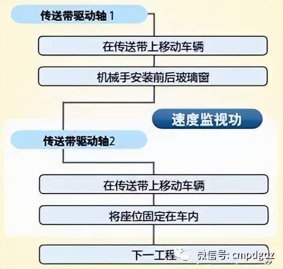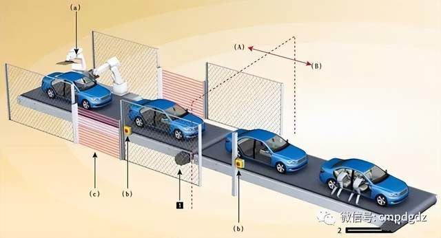 该案例适用于各种生产线设备、压入机、冲压机、印刷机、立式成型充填封口机、卧式成型充填封口机等。 1 传送带驱动轴1 2 传送带驱动轴2 (A) 玻璃窗安装工程(无人) (B) 安装座位工程(有人) (a) 玻璃窗安装机械手 (b) 紧急停止按钮 (c) 光幕