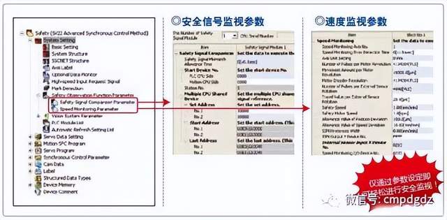 在系统构成画面中进行伺服放大器、伺服电机的设定。 步骤3:安全监视功能参数的设定 通过安全信号参数设定安全信号模块的使用台数,通过速度监视参数设定速度监视轴编号及安全速度等。 Q172DSCPU在搬运设备中的应用