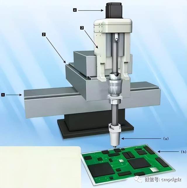 该案例适用于螺帽拧紧机、汽缸盖加固机、离合器加固机、压入机、铆接机等设备。 1 X轴 2 Y轴 3 上下轴(Z轴) 4 旋转轴 (a) 拧紧机 (b) 工件