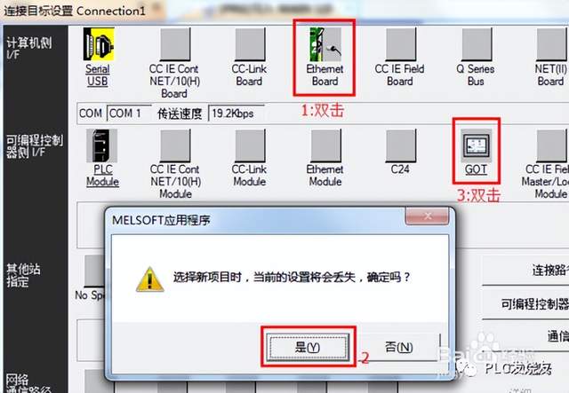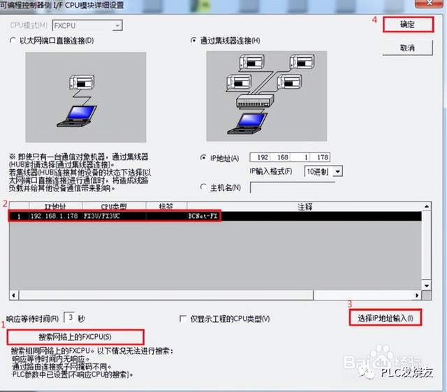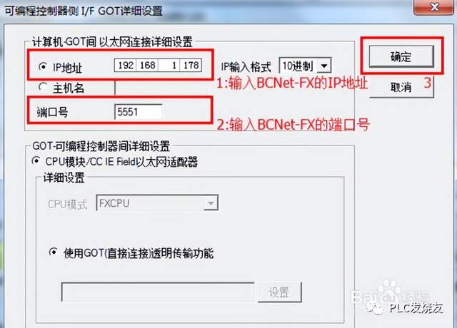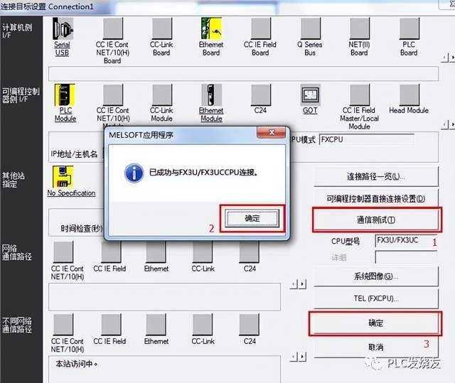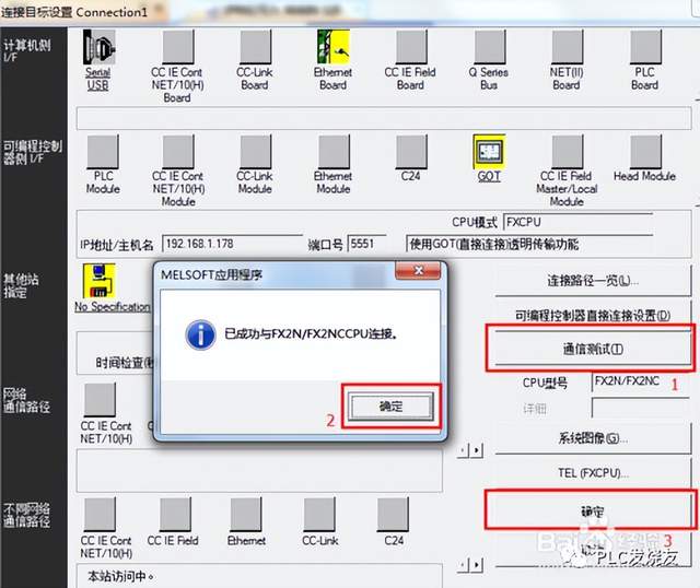 1 适用于FX3G/3GC、FX3S、FX3U/3UC 该方式适用于FX3G/3GC、FX3S、FX3U/FX3UC这些3系列的FX,本次通过BCet-FX实现GX Works2以太网连接FX3UC为例,说明使用步骤: 新建FX3U/FX3UC工程,双击导航栏中的连接目标:Connection。 1)跳出的选项板后,在计算机侧选择双击“EthernetBoard”选项,随后提醒中点击“是”;在可编程控制器侧双击“PLC Module”; 2)在随后的跳出的设置中,点击“搜索网络上的FXCPU(S)”后,会搜索到BCNet-FX所连接的FX3UC。按图中标号依次选择后,最后点击确认; 3)在上述中选择好IP地址后,点击“通信测试”,即可提示与FX3UCCPU连接成功。 4)随后即可“在线”选项栏中,进行PLC的读取、写入和监视等操作。 2 适用于FX1N/1NC、FX2N/2NC、FX1S 该方式适用于全系列的FXCPU,选择此方式主要针对于FX1N、FX2N、FX1S系列的FXPLC使用。本次通过BCet-FX实现GX Works2以太网连接FX2NC为例,说明使用步骤: 新建FX2N/FX2NC工程,双击导航栏中的连接目标:Connection。 1)跳出的选项板后,在计算机侧选择双击“EthernetBoard”选项,随后提醒中点击“是”;在可编程控制器侧双击“GOT”; 2)在随后的跳出的设置中,在IP地址中输入BCNet-FX的IP地址,在端口号中输入BCNet-FX的端口号。按图中标号依次选择后,最后点击“确认”; 3)在上述中选择好IP地址后,点击“通信测试”,即可提示与FX2NCCPU连接成功。 4)随后即可“在线”选项栏中,进行PLC的读取、写入和监视等操作。 注意事项 BCNet-FX支持三菱FX系列PLC BCNet-Q支持三菱Q系列PLC |
