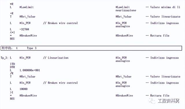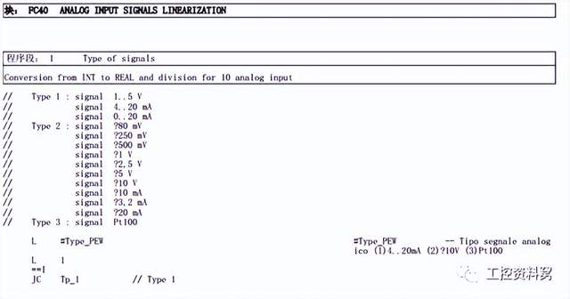 现在简要介绍在S7-300/400的下位程序step7的几个编程方法,供大家参考。 1、I/O数字量模块数据的读写方式 在PLC编程中,通常开关量的读和写用具体地址,如I0.0,I0.1....和Q0.0,Q0.1......来表示 在具体实践中发现不太方便。 为了数字量管理使用方法,首先建立DB块作为中间数据库(这里输入用DB100,输出用 DB101),将数字量存在中间数据库中,后续程序(FC块)直接读写中间数据块的数据即可。 数字量模块数字转化方式如下图。 A、输入,将数字量模块的数据按1字节或双字节,按顺序传到中件数据库 DB100中,完成数据输入. B、输出,将DB101数据库中数据,按1字节或双字节传到数字量输出模块中,完成数据输出。 在OB1 控制快中,将FC100,加入进去,程序在每一个循环周期自动完成转换。 注意 DBX 表示位,DBD表示8位,即1字节,DBW表示16位即2字节,DBD表示32位即4 字节 2、模拟量输入转化子程序 该FC40作为子程序,将模拟量输入模块采集的数据(4-20ma)转换成实际值存到中间数据中 在转换程序中调用. 调用使用程序如下.. 2、模拟量输出转化子程序 在实际工程中通常控制变频器转速或调节阀,据需要将模拟量(0-100)来控制模拟量输出模块转换成 4-20ma。就要进行转换。fc41就是该模块的转换控制子程序. 下列就是该子程序的使用,这个常常与pid模块配合使用,将PID输出的结果,经该转换成 4-20ma |