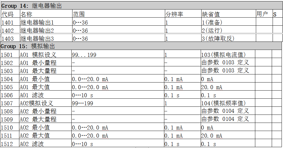 对应的是开关量及模拟量输入端接口的设定,一般有启动方式(本地/远程选择)、启动/停止、正转/反转、多段速度控制、模拟电流及模拟电压输入选择等。ABB-ACS550变频器此类参数设定在10号、11号、12号参数组内。