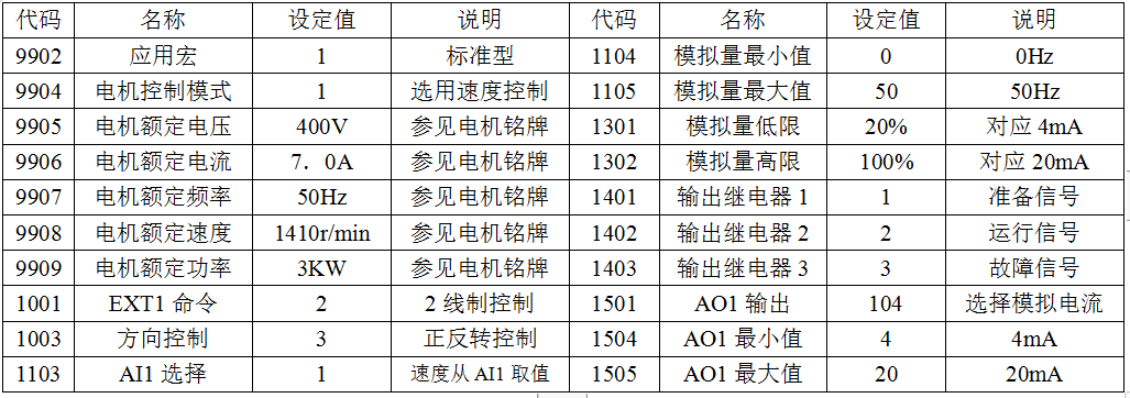 1、设计思路 选用一台具有正反转功能的变频器,功率为3KW,因为功率较小电磁干拢不大,可以不考虑输入电抗器,DCS控制需有变频器的状态信号(准备、运行、故障),以及实际电流信号,变频器的启停及正反转由DCS作控制,速度控制DCS采用4-20mA模拟信号作控制。 2、变频器控制回路设计图 3、变频器参数设定 其它参数可用变频器默认值,改善变频器及对电机的控制特性,如加、减速,U/F曲线等由调试中按实际运行调节设定。 4、实际安装及接线时应注意要点 实际安装中注意模拟量信号线的屏蔽,屏蔽接地在DCS侧,变频器侧悬空;模拟量信号变频器默认为0-20mA,所以必须要设定为4-20mA;因故障反馈信号是由输出继电器3得到,该信号设置1403为故障反信号,所以接线注意接常闭点,其它二个反馈信号接常开点;同时必需检查变频器的各个跳针与设定是否正确;其它按变频器前述安装要求进行。 |