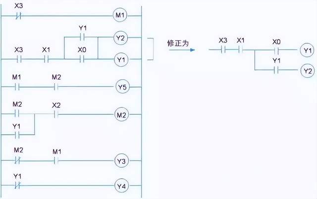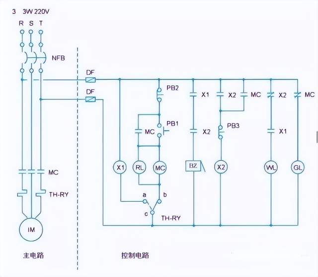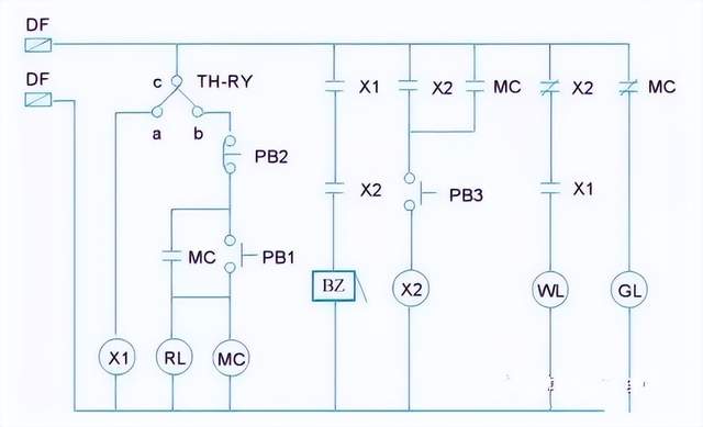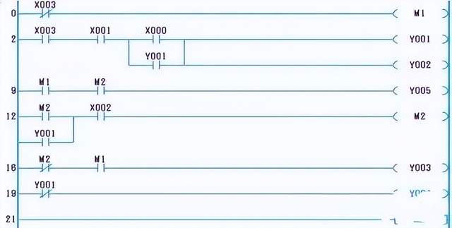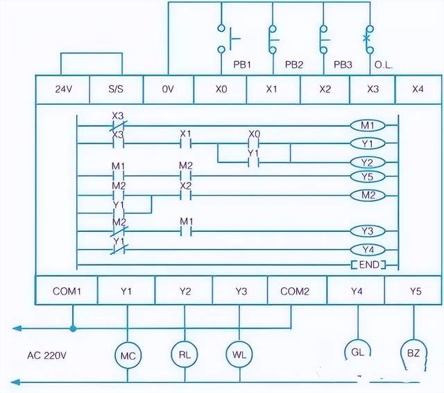PLC程序设计,一般均采用直觉法,也就是说它植基于电路设计者本身之学习经验,较为主观及直接。须经历一段瞎子摸象的尝试错误(tryanderror)时期,对程序进行除错之后才能符合所需功能或动作要求;因此设计出来的程序因人而异,除了原程序设计者之外,使用者或维修人员较不易理解其动作流程,亦即程序的可读性较低。 但程序设计其实有些许脉络可循,只是坊间的书籍很少提及这一部分。以下姑且抱着野人献曝的心情,以『三相感应电动机故障警报控制』电路为例,由传统电工图转换为阶梯图的过程,浅谈程序设计,相信尔后对于相关的回路转换或程序设计,您或许可触类旁通。 1、传统电工图 已知的三相感应电动机故障警报控制电路,其传统电工图,如图1所示。 图1 三相感应电动机故障警报控制电路图 2、动作说明 1.电源正常时,仅绿灯gl亮,电动机不动作。 2.按下启动按钮pb1,电磁接触器mc动作,电动机立即运转,指示灯rl亮,绿灯gl熄。 3.按下停止按钮pb2,电磁接触器mc断电,电动机停止运转,指示灯rl熄,绿灯gl亮。 4.电动机在运转中,因过载或其它故障原因,致使积热电驿th-ry动作,电动机停止运转,蜂鸣器bz发出警报,指示灯rl熄,绿灯gl亮。 5.按下按钮开关pb3,蜂鸣器bz停止警报,白灯wl亮,绿灯gl亮,红灯rl熄。 6.故障排除后,按下积热电驿th-ry复归杆,则白灯wl熄,绿灯gl亮,红灯rl熄,可以重新起动电动机。 3、i/o编码 使用plc,就是以软件程序来取代硬件配线。传统电工图当中,主电路是plc无法取代的; plc可以取代的部分,是控制电路。由传统电工图转换为阶梯图的第一个步骤,就是i/o编码,亦即将传统电工图中的输入/输出组件,先行确定其在plc中所拟对应之外部输入/输出端子编号,以及外部输入组件接线方式是采用a/b接点,如表1所示。 (a):外部採a接点方式接线 (b):外部採b接点方式接线 4、plc外部接线图 输入/输出组件经i/o编码,并决定外部输入组件是采用a/b接点接线方式后,plc外部接线图如图2所示。图中所示为丰炜vigor-vb系列plc机种,采用npn接线,亦即24v端子与s/s端子并接。 图2 plc外部接线图 5、plc阶梯图 由传统电工图转换为阶梯图之程序设计步骤如下: (1)将电工图中控制电路直接转成对应阶梯图。因为plc阶梯图中规定,接点在前,输出线圈则必须位于回路的最后。故首先须重新绘制电工图,将图中接点与输出线圈位置适度变更,以符合plc阶梯图的要求,重新绘制后的电工图,如图3所示。 图3 重新绘制后的电工图 (2)以i/o编码后的组件编号,取代电工图中的输入/输出组件,此处要留意的是,th-ry的c-a接点及c-b接点要独立出来,各自成为一个控制回路,如图4所示。 图4 i/o编码后的的电工图 (3)将图4所示的电工图,向左旋转90°,之后再垂直翻转(upsidedown),即可成为plc阶梯图,但因: ■ y1、x0接点 ■ 输出线圈y1和y2 不符合一般编程软件格式,故须适度更正,如图5右方所示。 图5 适度翻转并修正后的阶梯图 ■ 若您使用visio来绘制电工图,则向左旋转90°,之后再垂直翻转,就变的很简单。 (4)使用编程软件绘制之阶梯图,如图6所示,与适度翻转并修正后的阶梯图,完全相同。 图6 编程软件绘制之阶梯图 6、指令 将阶梯图转换为指令,则如下所示: 7、plc转换接线与阶梯图 传统电工图完整转换后之plc外部输入/输出接线与阶梯图。使用软件程序取代硬件配线后之plc外部输入/输出接线与阶梯图,如下图7所示。 图7 以软件程序取代硬件配线后之plc 8、结束语 plc其研发目的在于取代以继电器为主之顺序控制,亦即使用软件程序以取代硬件配线,因此祇要改变其软件程序即可改变其控制的顺序,而轻易的达成控制上之不同需求。一般的plc系以传统继电器控制回路为基础发展而来,并将继电器的接点和线圈予以符号化,当转换成一般的阶梯图或指令之后,即可实现其控制。 但如此所完成的控制回路,是基于电路设计者本身之学习经验,较为主观及直接,一般使用者往往不易理解其动作流程,亦即程序的可读性较低。 |