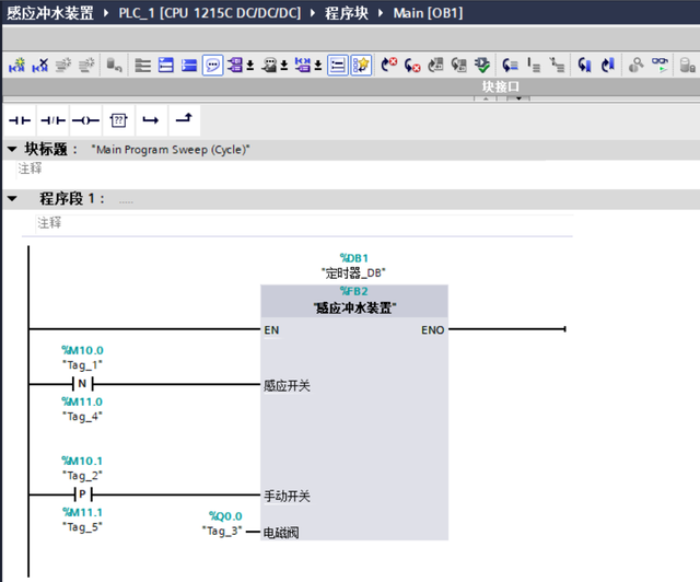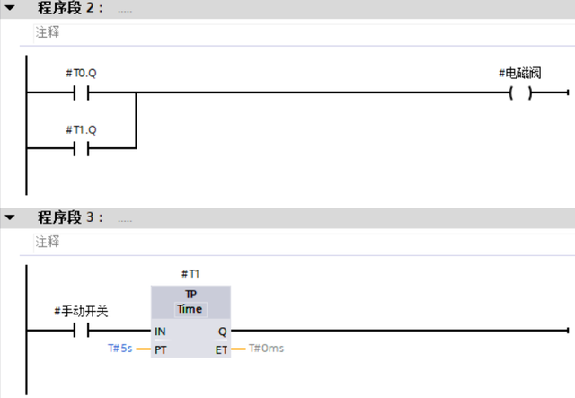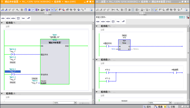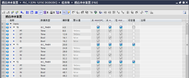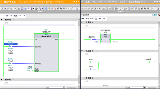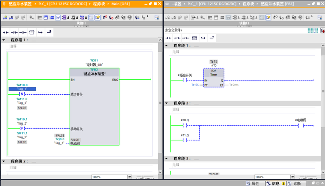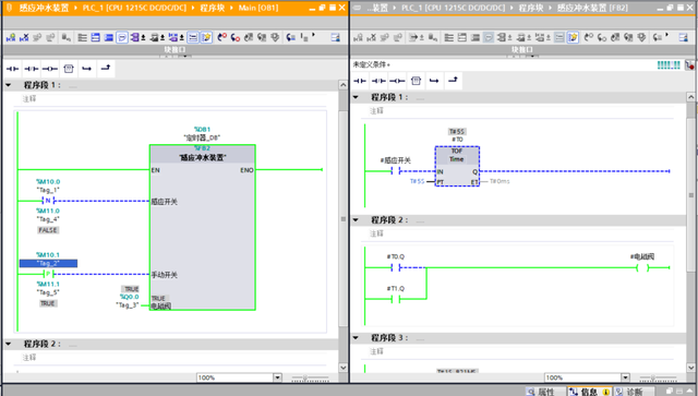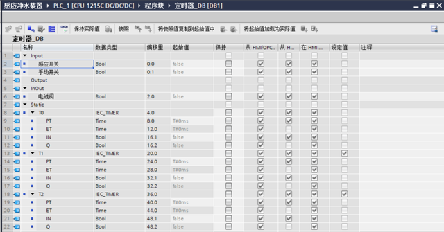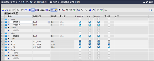 说到感应手自动冲水装置,想必大家首先想到的肯定是抽水马桶或各大卫生间冲水装置。对,没错,就是这些,这些肯定不是使用的是PLC控制的,成本高,不划算,那么是否可以使用PLC实现这样的功能呢?此时大家思考一下,是可以的,可以对吧!那么如何实现呢?接下里,进入技成自动化每日带你扩大工控知识面,助力成就每一位学子。 一、控制要求自动控制时:当有东西或人靠近时,感应红外线开关被遮挡接通,但不工作,一旦再次检测到东西或人不在时开始触发电磁阀冲水,冲水时间控制在5s左右,断开电磁阀关闸,后续重复上述动作。 手动控制时:当人触发或按下冲水按钮时,冲水电磁阀打开冲水,冲水时间控制在5s左右,断开电磁阀关闸,后续重复上述动作。 二、程序设计第一步:(创建FB块并填写接口参数地址) 第二步:(使用断开延时定时器实现自动冲水功能) 第三步:(使用脉冲型定时器实现手动冲水功能) 第四步:(定时器采用多重背景功能进行调用,减少使用DB块) 第五步:(打开多重背景DB块查看地址) 第六步:(在OB主程序调用感应冲水FB功能块并填写接口全局地址) 三、程序演示第一步:(自动感应冲水程序) 第二步:(手动感应冲水程序) 四、程序设计思路 (1)自动感应开关,当人或物品遮挡时,电磁阀不能动作,等物品或人离开不被遮挡电磁阀才能动作,应采用沿脉冲中下降沿N来做自动感应开关,下降沿功能优势在于触发时不产生脉冲输出,只有断开时才能产生脉冲输出,因此自动感应开关(红外线)给PLC一个信号1触发下降沿代表有人或有物品正在如厕等,当感应开关给PLC一个0信号代表此时人已离开下降沿动作开始冲水并定时5s断开。 (2)手动感应开关,按下开关直接输出,采用上升沿,上升沿触发立刻输出脉冲动作并定时5s断开。 来源:技成培训网,作者:技成-徐陈爽,未经授权不得转载! |