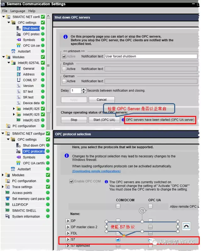 - 在shut down OPC Server下,启动OPC Server。在OPC protocol selection下使能S7协议