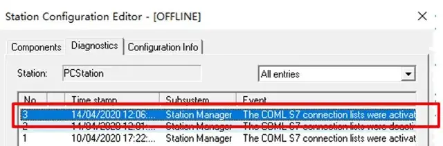 - 在“开始”菜单中 ,搜索并打开STATION CONFIGURATOR。在Station ConfigurationEditor中,选择Diagnostics”选项,在该诊断区可以查看COML S7连接是否已经激活。