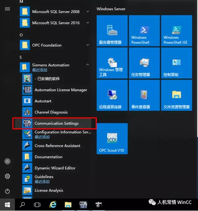 - 单击“开始”按钮,点击 “Siemens Automation-〉SIMATIC-〉Communication Settings。