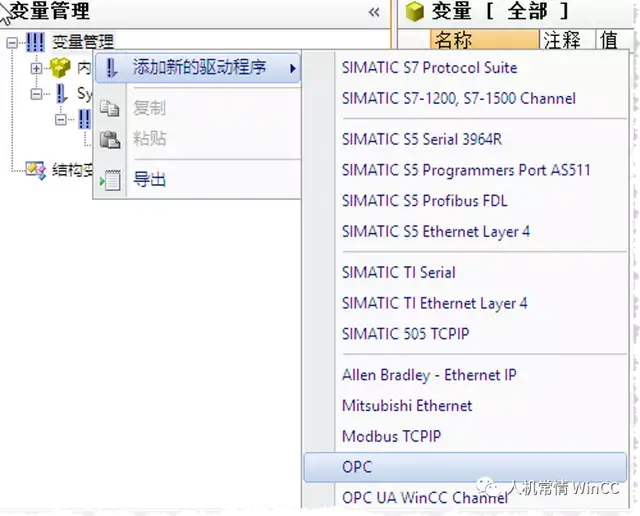 - 在WinCC Configuration Studio中,右击“变量管理”,选择“添加新的驱动程序”,添加OPC
