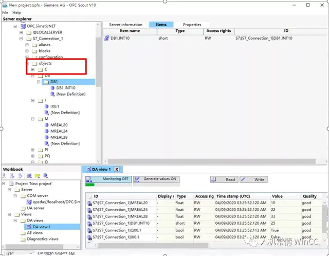 - 从 “开始”菜单中,搜索并打开 SIMATIC NET 中集成的 OPC Scout.在COM Server> Local COMserver>OPC.SIMEATIC NET> S7_CONNECTION_1>objects路径下建立变量:MD20/ MD24/ MD28/ VB10/ Q0.1/ I 0.1Scout 也是OPC 客户端,可测试与CPU的通信连接