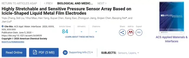 随着物联网和机器人技术的迅速发展,不断涌现出各种高灵敏度、低检测极限、快速响应的压力传感器。然而,如何使压力传感器同时具备优异的电学性能和机械拉伸性能仍然是该领域面临的挑战。 液态金属天然具有金属导电性以及常温下的流动性,近年来在柔性器件领域得到广泛应用。最近,苏州大学的刘坚教授和聂宝清副教授团队利用镓铟合金,设计了一种超柔性可拉伸的电容式压力传感器阵列,可以在在各种弯曲状态以及极端拉伸状态下保持良好的压力传感性能。该论文发表于《ACS Applied Materials & Interfaces》 (DOI: 10.1021/acsami.0c04939) 该传感器由两层嵌于Ecoflex弹性体中的液态金属薄膜电极组成,其中顶层电极具有增加灵敏度的穹形结构。由于液态金属较大的黏度,对于超小超薄的通道难以通过注射的方式填充,而其流动性又进一步增加了制备含三维结构器件的难度。该研究工作采用先分层加工的方式封装液体金属薄膜,后利用负压创造穹形结构的方法克服了这一技术挑战,实现了在弹性体基底上可重复地制备阵列式穹形结构的液态金属薄膜电极。 由于传感器单元独特的穹形结构电极,在拉伸状态下,应变主要集中于平面薄膜部分,而非穹形突起部分,因此该传感器检测的压力信号不易受到拉伸形变的干扰。同时,由于传感器的电容式传感机理以及Ecoflex良好的密封性,该传感器基本可以免疫环境因素的干扰,在各种温度和湿度条件下保持优良的压力传感性能。 这种穹形结构的电极可以降低在外力作用下各传感单元之间的机械干扰,因此,该传感器阵列可以对不同类型的荷载(集中/分散)进行受力分析,以推测施力物的轮廓特征。该传感器阵列还可以用于人体姿势的检测。比如,不同颈部姿势下,传感器各单元检测到的压力会发生变化。通过记录不同颈部姿势下传感器检测到的压力分布状态,可以由传感器的输出信号反推颈部姿势,进而可用于对接受康复训练的患者进行颈部姿势的检测,并提供及时的提醒。 该研究设计制备了一种穹形结构液态薄膜电极,以及低成本、易操作的可拉伸压力传感器阵列,为柔性传感领域的器件制备提供了一种新的参考方案。 参考文献: YiqiuZhang, Sidi Liu, Yihui Miao, Han Yang, Xuyue Chen, Xiang Xiao, Zhongyun Jiang,Xinjian Chen, Baoqing Nie,* and Jian Liu*, A Highly Stretchable and SensitivePressure Sensor Array Based on Icicle-Shaped Liquid Metal Film Electrodes. ACSApplied Materials & Interfaces (DOI: 10.1021/acsami.0c04939) 来源:名称:材料科学前沿 ID:MaterialFrontiers |