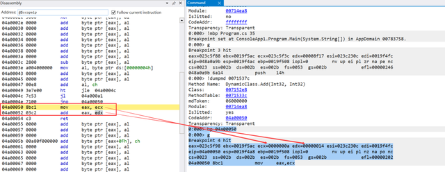 方法描述符果然给调出来了,但这里的方法字节码是 CodeAddr: ffffffff ,说明此时动态方法还没有开始编译,为了能够使其编译,我们在 Console.WriteLine(addDelegate(10, 20)); 处再下一个断点,因为代码到此处时, JIT 肯定编译了该办法,自然就能看到编译后的 CodeAddr 地址。