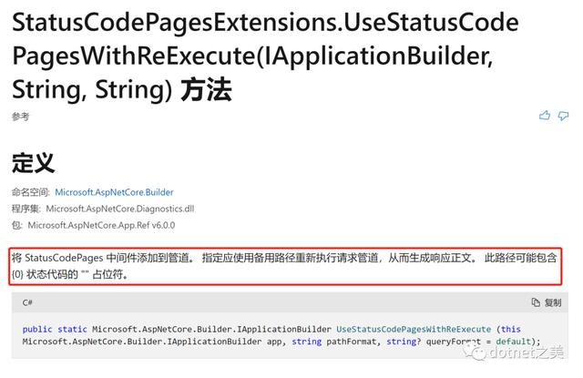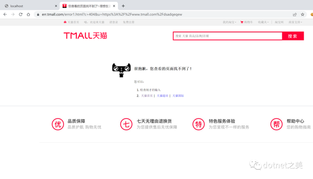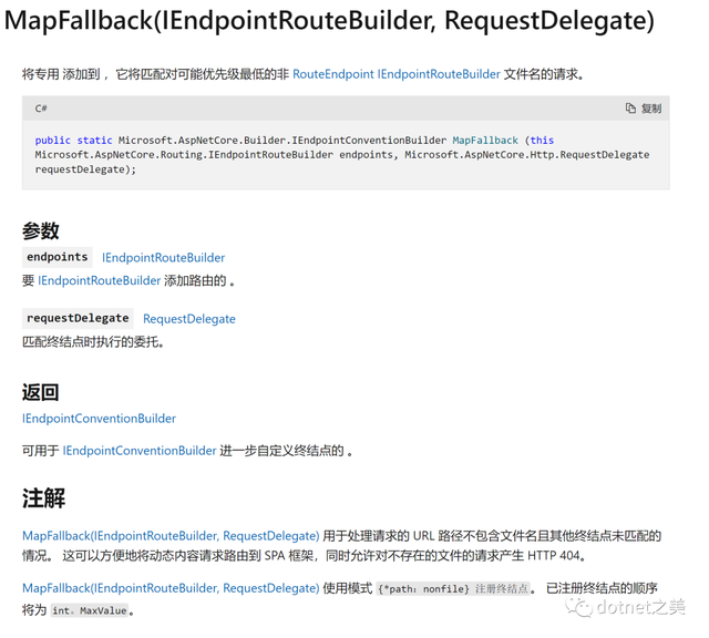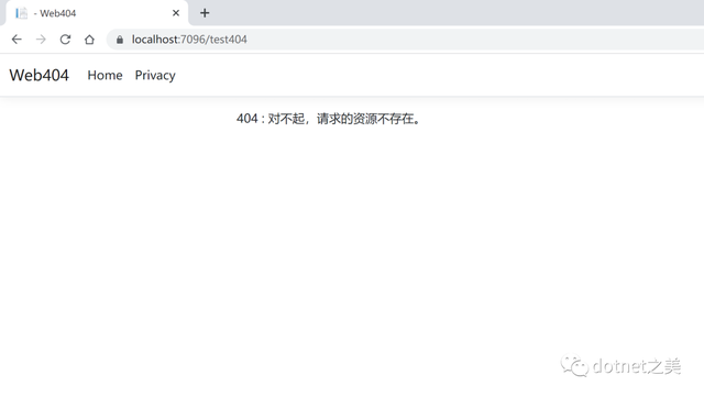 以下文章来源于dotnet之美 ,作者Gui.H dotnet之美. 领略dotnet之美! 当未找到网页并且应用程序返回 404 错误时,ASP.NET Core MVC 仅呈现通用浏览器错误页面,如下图所示这不是很优雅,是吗?我们平时看到的404页面一般是这样的还有这样的试了下京东,地址不存在的时候是会重定向到首页下面就来演示下ASP.NET Core中如何实现这种自定义的404页面处理。新建项目 ASP.NET Core MVC(WebApi处理方式也一样)新建好的项目直接运行的效果随便输入一个地址 /test404当未找到网页并且应用程序返回 404 错误时,ASP.NET Core MVC 仅呈现通用浏览器错误页面,如下图所示 方式一 FallbackEndpointRouteBuilderExtensions.MapFallback这是个什么东西? 意思大概是说这是注册一个优先级最低的通配路由,来匹配所有路由,那就来试试效果吧。