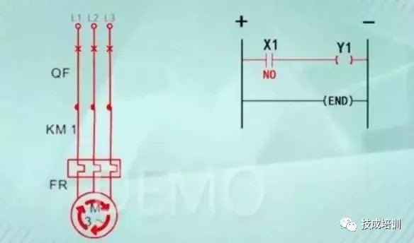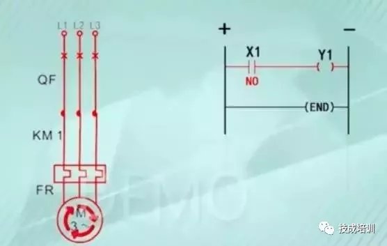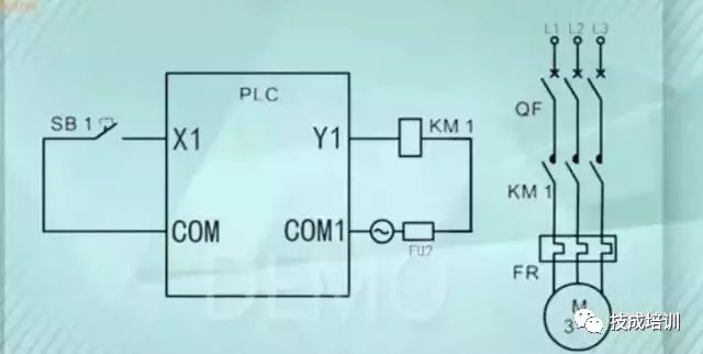 常开按钮SB1接到PLC的输入点X1,当我们把SB1按钮按下输入回路就接通了,X1就得到一个IO信号,X1的IO信号送到PLC内部进行运算,就输出一个信号,输出的信号Y1将输出回路接通,KM1线圈得电,对应的主电路中的KM主触点就吸合了,我们再看下面这个图:
