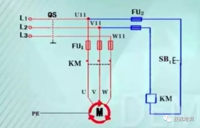 2、控制电路(也称为辅助电路):由FU(熔断器)、SB(常开触点)、KM(接触器线圈)构成。