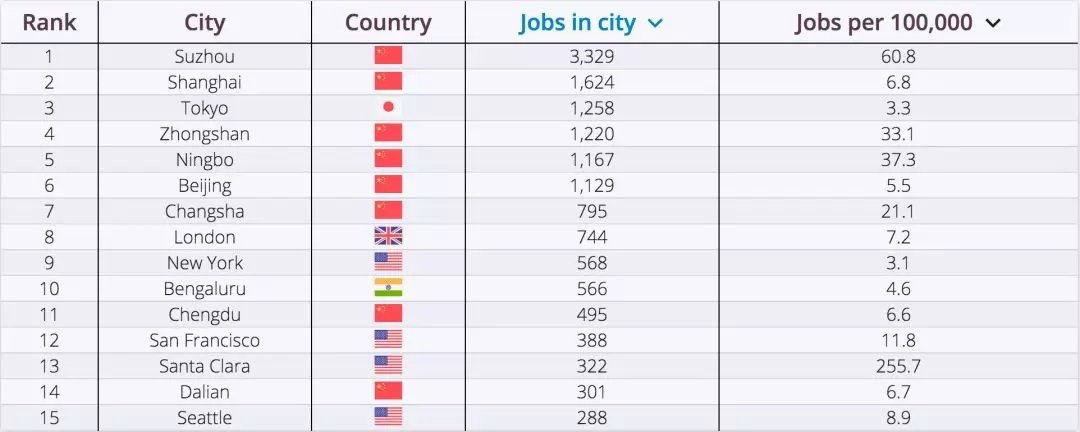 不出所料,前十大城市中有六个在中国(苏州、上海、中山、宁波、北京、长沙)。除此之前,Top10大城市中,日本东京排名第三名,英国伦敦排名第八,美国纽约排名第九,印度班加罗尔位列第十。