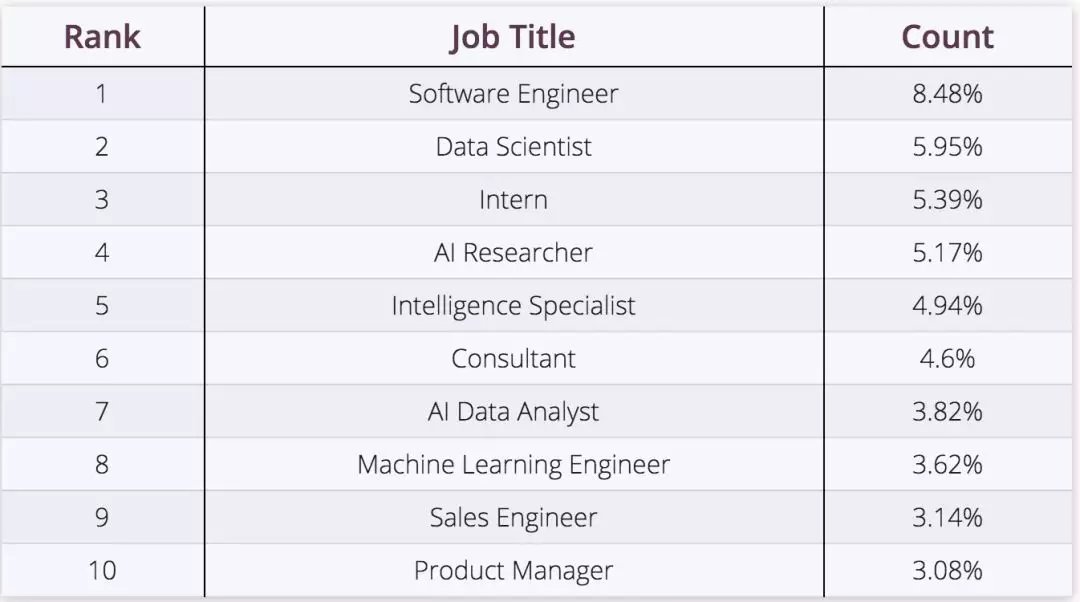 在AI岗位方面,UiPath也列出了招聘中最热门的十大AI岗位,排在前三位的分别是软件工程师、数据科学家和实习生,AI研究人员位列第四。