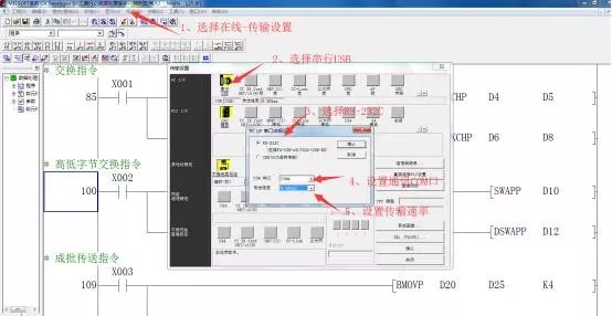 3、打开你要下载FX PLC程序,执行菜单命令【在线】-【传输设置】,如下图设置: