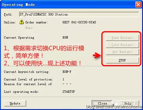 运行模式。在此模式下,CPU执行用户程序,还可以通过编程设备读出、监控用户程序,但不能修改用户程序。 STOP: