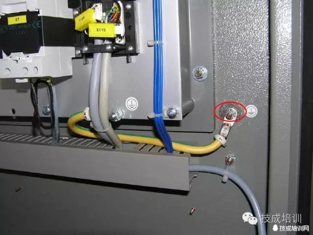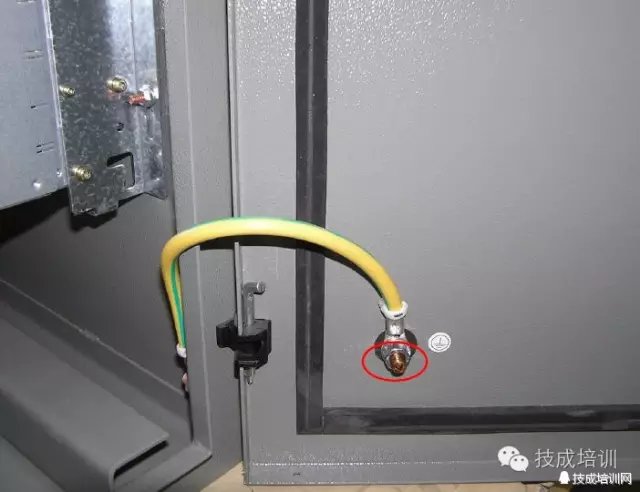 柜内任意两个金属部件通过螺钉连接时如有绝缘层均应采用相应规格的接地垫圈并注意将垫圈齿面接触零部件表面(红圈处),或者破坏绝缘层。