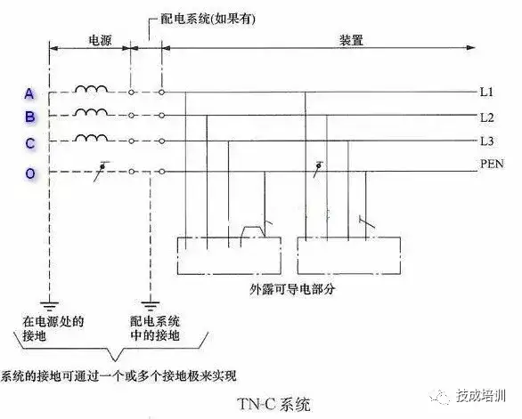 由于我们每户居民的配电是按单相配电来设计的(土豪,大户人家380V配电),因此我们的电压都是单相电压220V,也就是上图中每一相(L1或L2或L3对PEN线)对PEN线的电压。(如果在入户前PEN进行重复接地,并分出N线和PE线,那么居家用电就变成了TN-C-S系统了,所以我们会看到入户后原本的2根线变成了3根线)。