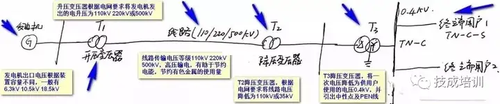 电能是通常是由发电机发出来的(当然,现在的新能源,如:太阳能发电,风力发电等也很多),然后经过发电厂的升压变压器升高至电网规定的电压等级,经过线路传输后送至负荷中心,再经过降压变压器将电网电压降低为适合用户使用的电压等级,也就是我们常说的380V(实际变压器二次侧电压是0.4kV,因为要考虑线路损耗压降),这样就出来了380V,具体整个生产,变压,输送的过程如下图所示:
