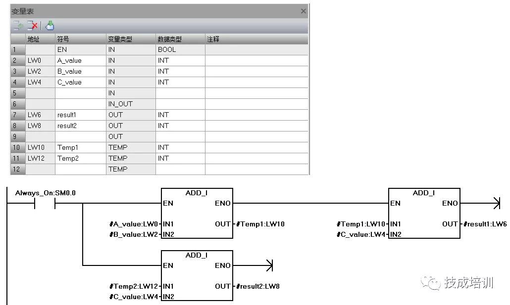 变量类型TEMP称为临时变量,该变量与前面所介绍的三种变量的最大区别就是不参与对子程序数据传递,即不把外围的数据传入到子程序,也不把子程序的运算结果传递出子程序,该变量主要用于子程序的内部暂存中间运算结果使用,所以该变量类型无需赋实参。