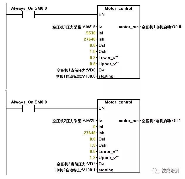 (1)由于空压机的启动方式是相同的,但上下限压力设定以及传感器的输出信号和检测范围都不同,所以在编写程序是,可考虑建立一个带参数的功能块,然后把这些参数作为实参赋值到该子程序的形参上。