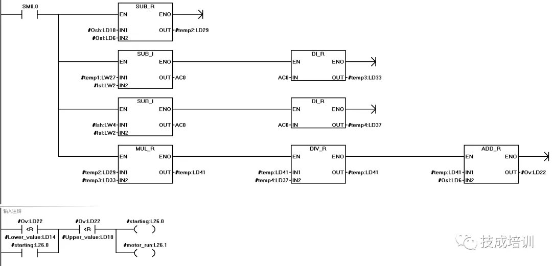 当控制要求相同或具有相同的算法时,(如对电机的控制,若需要对多台电机进行控制,且每台电机具有相同的控制方式)此时可考虑根据该控要求,编写一个功能块,然后重复调用该功能块,然后赋予不同的实参来实现该控制,如同所示: