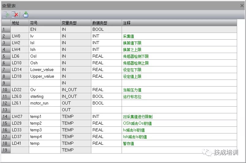 (1)程序编写及变量表的建立,按照上述分析对该程序中需要用到的变量表进行建立,并对每个变量,分配好对应的数据类型,变量表的建立和变量数据类型的分配入下图所示: