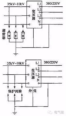 4低压侧装设阀型避雷器或保护间隙 低压侧装设避雷器主要在多雷区使用,以防止雷电波由低压侧侵入而击穿变压器的绝缘。当变压器低压侧中性点不接地时,其中性点也应加装避雷器或保护间隙。