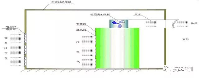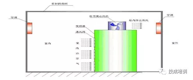 特点: 1)施工简单,维护量大(定期清洗滤网)。 2)费用低,散热效果较好。 3)运行稳定性依赖于当地环境,适用于环境较好,粉尘少的场合。 方式二:室外冷风—变频器--热风--室内-室外 优点:无额外的风道或空调成本。适合北方冬季使用。 缺点:散热受外界温度影响大,变频器很容易因过热而故障停机。 方式三:房间密闭室内空调制冷--室内冷风—变频器--热风--室内。 优点:由于室内外空气没有直接流通,容易保证室内环境清洁,空调冗余配置。 缺点:空调的可靠性会影响变频器的稳定运行,空调费用高,运行费用高。 方式四:室内冷风-变频器-热风-空水冷散热器-冷风-室内