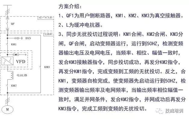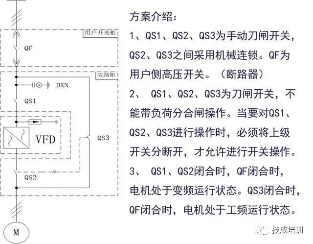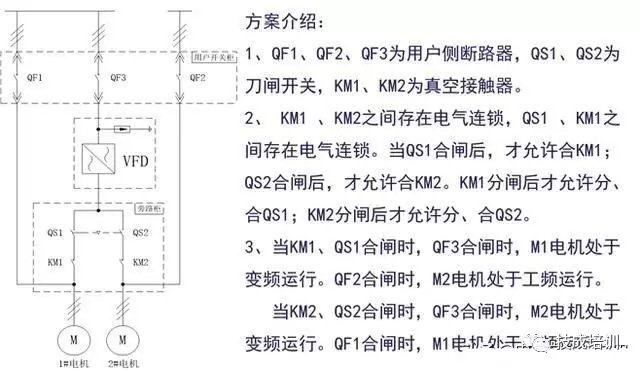 变频器旁路方式: (1)一拖一手动刀闸旁路方案