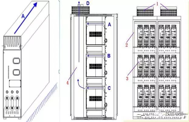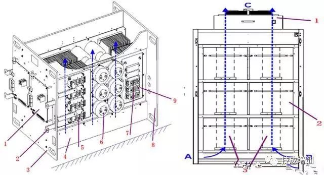 变频器整机散热方式: 方式一:室外冷风—变频器--热风---风道引至室外