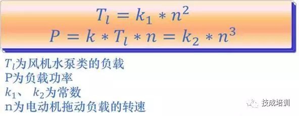 对于风机、泵类平方转矩负载,电机的输出功率与电机转速的立方成正比。 风机水泵类负载一般称为平方转矩负载,及转矩与转速成平方关系;其功率等于转矩乘转速,即功率是与转速成三次方关系,这个也就是风机水泵类采用变频调速以后节能的基本原理。 专业术语: 平方转矩负载:在各种风机、水泵、油泵中,随叶轮的转动,空气或液体在一定的转速范围内所产生的阻力大致与转速n的2次方成正比。随着转速的减小,转矩按转速的2次方减小。这种负载所需要的功率与速度的3次方成正比。 恒转矩负载:负载转矩TL与转速n无关,任何转速下TL总保持恒定或基本不变。例如传送带、搅拌机、挤压机等摩擦类负载以及吊车、提升机等位能负载都属于恒转矩负载。 恒功率负载:机床主轴和轧机、造纸机、塑料薄膜生产中的卷取机、开卷机等要求的转矩大体与转速成反比。这就是所谓的恒功率负载。