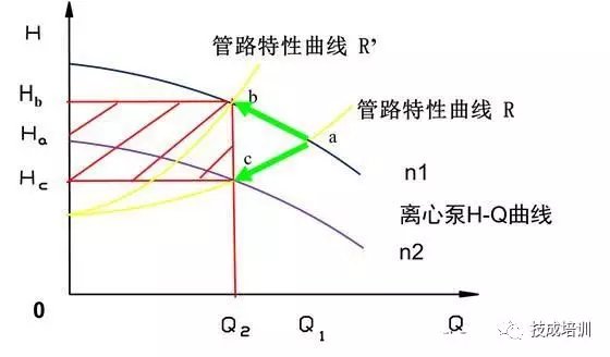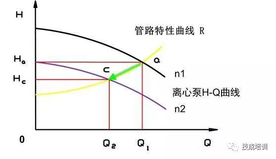 减量操作(Q1-Q2): 调速调节时泵工作点的变化: