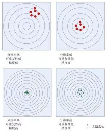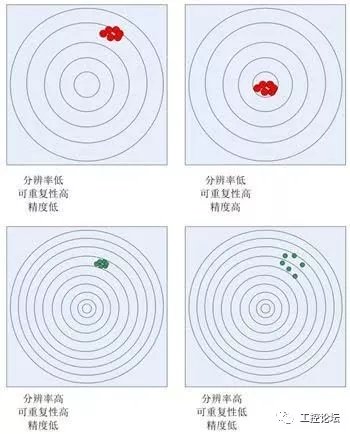 下边我们通过一幅图来感受一下三者的关系:   而我们通常讨论精度的时候,常常将“精度”和“可重复性”二者合二为一,我们往往认为精度更倾向于用“真实度”来表示。当我们讨论精度时往往指的是“可重复性高的高精度”。