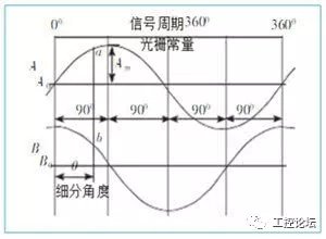 一个编码器的分辨率依赖于其编码器的刻线数(增量编码器)或者编码器码盘模式(绝对值编码器)。一般来说,分辨率是一个固定值,一旦编码器被制造出来就没办法再增加刻线数或者编码。但是增量编码器可以通过信号细分来增加分辨率,例如,方波增量编码器(HTL/TTL)输出增量方波信号,通过每次记录每个增量通道(信号A)的上升沿和下降沿,可以提高两倍的编码器分辨率。这样当我们记录两个通道(信号A和B)的上升沿和下降沿时,我们可以提高四倍的编码器分辨率(4倍频),如下图所示。  对于采用sin/cos信号的编码器,相对于方波信 号,我们可以通过θ来对电信号进行细分以提供更高的分辨率,如下图所示。