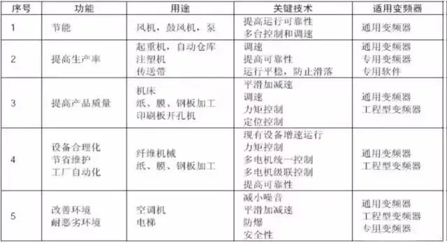 三、变频器的应用目的及用途变频器和交流电机构成的可调速传动称为变频器传动,其功能用途如下。其中可能互为关连,实际上无明确分类,此表仅作参考。