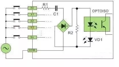 以上的情况只是针对,传感器是属于常开的状态下。3、按电源配置类型(1) 直流输入电路如图1,直流输入电路要求外部输入信号的元件为无源的干接点或直流有源的无触点开关接点,当外部输入元件与电源正极导通,电流通过R1,光电耦合器内部LED,VD1(接口指示)到COM端形成回路,光电耦合器内部接收管接受外部元件导通的信号,传输到内部处理;这种由直流电提供电源的接口方式,叫直流输入电路;直流电可以由PLC内部提供也可以外接直流电源提供给外部输入信号的元件。R2在电路中的作用是旁路光电耦合器内部LED的电流,保证光电耦合器LED不被两线制接近开关的静态泄漏电流导通。