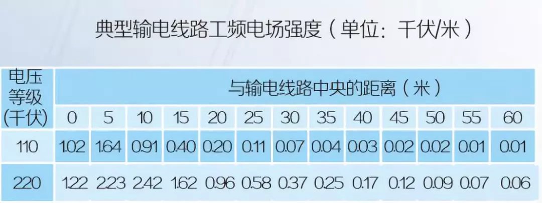 高压线周边工频电场强度的大小主要取决于线路电压的高低、线路导线的排列方式、截面积、导线对地高度和观测点与导线的距离等。典型110千伏、220千伏输电线路的工频电场强度如下表所示。