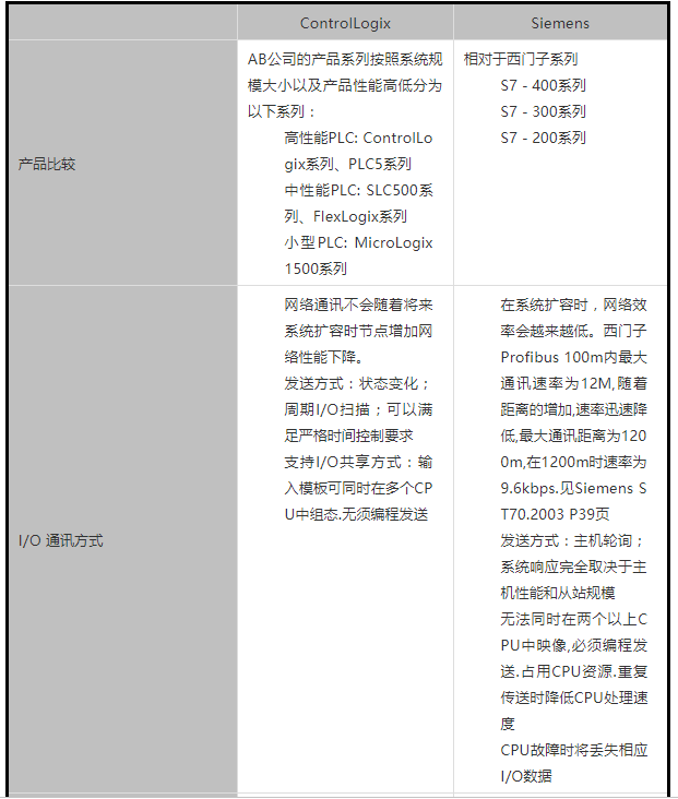 西门子与AB最主要的差别在于AB所使用的网络类型都是开放的网络,可以与其他公司的产品做到很好的兼容,AB控制层网络采用ControlNet网络,该网络是一种高性能的工业局域网,具有开放性、高效率、多功能、确定性和可重复性、灵活性等特点,扩展性极强,可共享I/O,并具有强大方便的网络组态,诊断功能及可靠性。