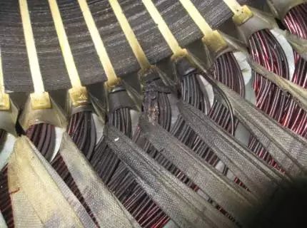 特征:绕组全部变黑色,端部扎带变色并且变脆甚至断裂。