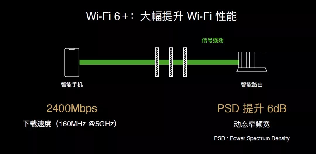 华为Wi-Fi 6+带来两大特性: 一是端到端支持160MHz超大频宽,近距离畅享双倍速度; 二是动态窄频宽技术,报文按需自动分片,确保路由和手机等终端设备可稳定工作在窄频宽模式,大幅提升手机等终端侧的功率谱密度,实现多穿一堵墙的效果。简单来说,近距离速度快一倍,远距离多穿一堵墙。