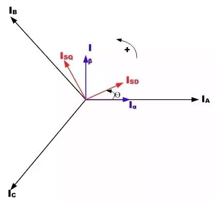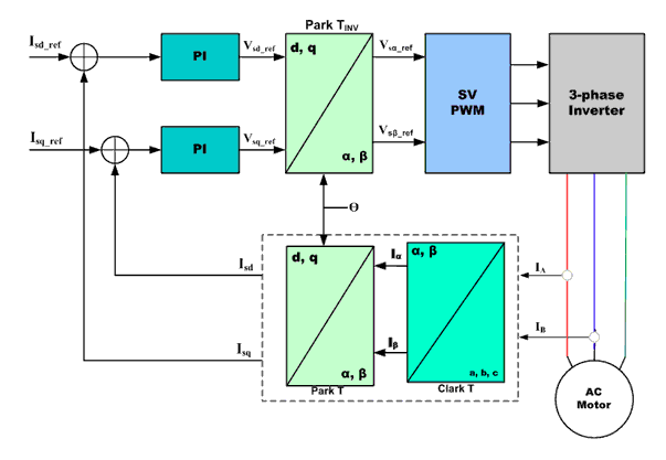 Clarke变换采用三相电流IA, IB 以及 IC,这两个在固定座标定子相中的电流被变换成Isd 和Isq,成为Park变换d, q中的元素。其通过电机通量模型来计算的电流Isd, Isq 以及瞬时流量角θ被用来计算交流感应电机的电动扭矩。