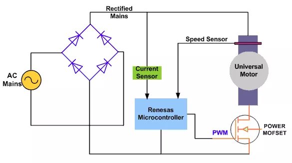 PWM控制是通用电机速度控制的,更先进的解决方案。在这一解决方案中,功率MOFSET,或者IGBT接通高频整流AC线电压,进而为电机产生随时间变化的电压。通用电机的PWM斩波控制
